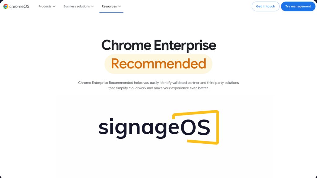 signageOS CloudControl has officially earned the Chrome Enterprise Recommended (CER) designation and has been awarded the CER badge, further establishing itself as a premier device management platform for digital signage. This designation confirms that signageOS CloudControl meets Google's stringent requirements for enterprise solutions, ensuring seamless integration, security, and optimized performance with ChromeOS. With this achievement, signageOS CloudControl not only validates its robust capabilities but also unlocks a host of benefits for ChromeOS users in the digital signage industry.