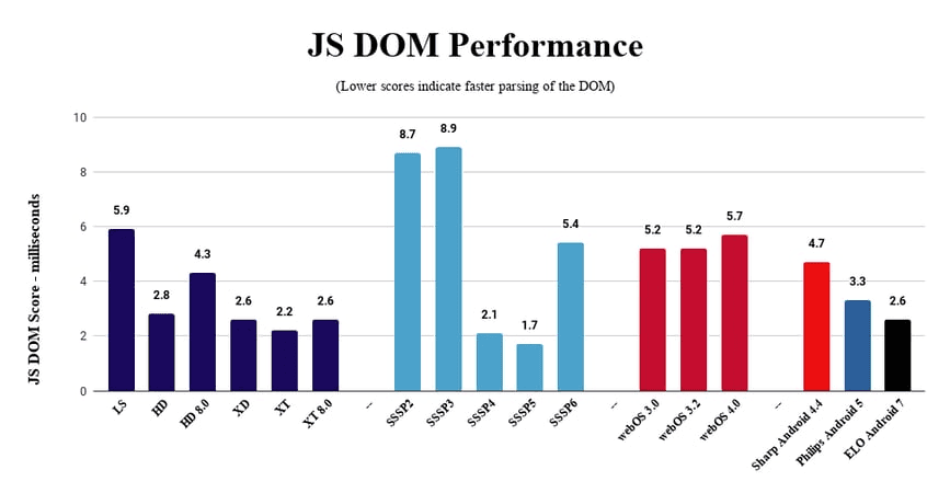 Compared to other platforms, the XT with FW version 7.0 scored the third best time behind SSSP4 and SSSP5. The SSSP5 display scored 1.7, the fastest time of any of the other tested devices. The LS model scored almost 3 full milliseconds faster than SSSP2 and SSSP3 but was less than 0.7 of a difference from the scores for WebOS 3.0, 3.2, and 4.0. The XD line’s performance scored identical to the ELO display operating on Android 7 at 2.6.