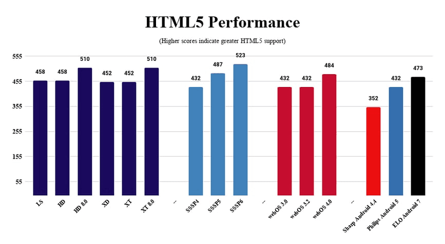 Using the HTML5 feature support test, all models operating on FW version 7.0 or 7.1 maintained HTML5 feature support scores in the 450 range. The LS, HD, XD, and XT, respectively, scored 458, 458, 452, and 452. The LS, marketed as the entry-level offering, and the HD, the updated and reliable classic, scored higher for HTML5 feature support than the XD and XT. Those scores are in the median range of Samsung SSSP4 at 432 and SSSP5 at 487. LG’s WebOS 3.2 scored 432 and WebOS 4.0 scored 484. Additionally, varying displays operating on Android 7 also scored in the 470’s.