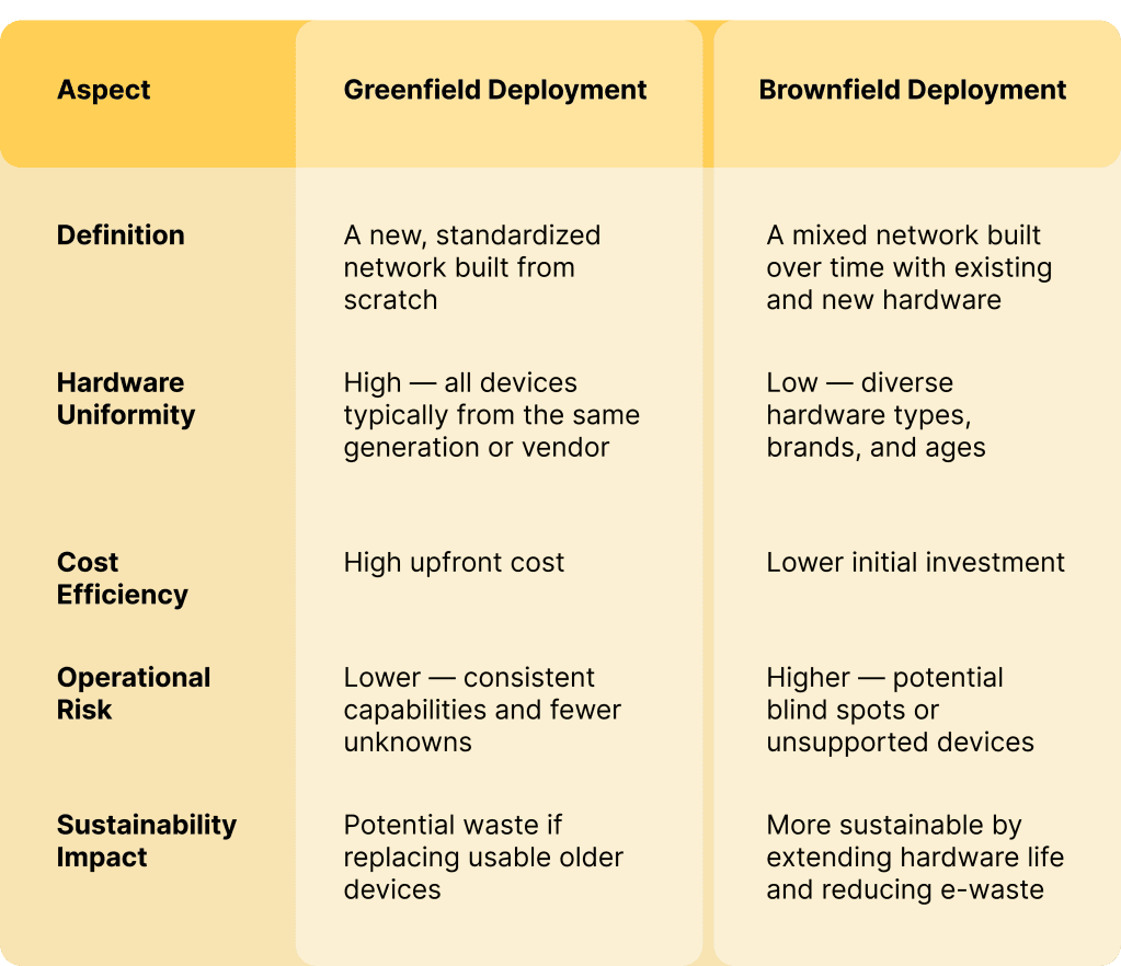 Brownfield deployments, on the other hand, grow organically over time, combining legacy and new devices, multiple brands, and varied operating systems.