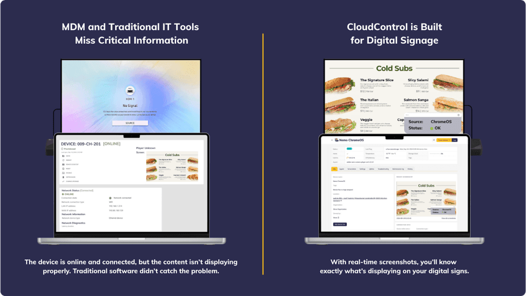 Mobile Device Management (MDM) and traditional IT tools were made for smartphones and laptops – not signage. They’ll tell you if a device is online. But they won’t tell you if the app is frozen, the screen is upside down, or the device is about to overheat.
