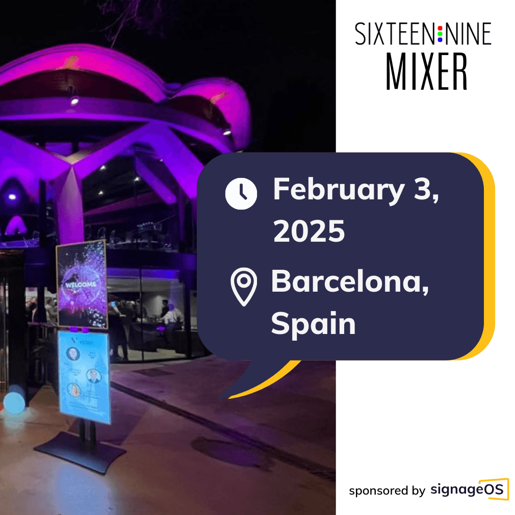 signageOS is proud to be a sponsor of the Digital Signage Sixteen:Nine Mixer, happening on February 3rd, 2025, during ISE in Barcelona, Spain. This key event brings together digital signage professionals from around the globe, and we’re thrilled to network, exchange ideas, and connect with the brightest minds shaping the future of digital signage.
