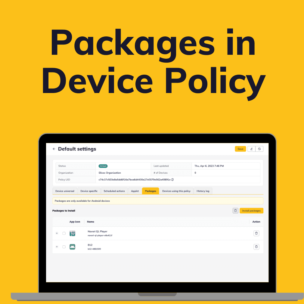 The latest update to Device Policy introduces "Packages". This allows for the streamlined management of your Android APKs on a larger scale.