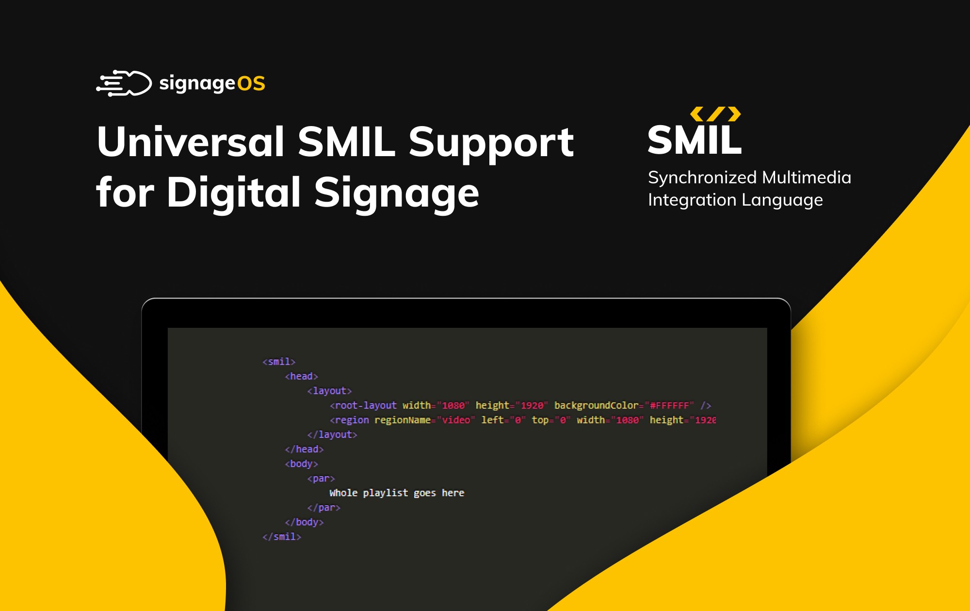 SMIL is a markup language that was created by the World Wide Web Consortium (W3C) to position, play, and schedule multimedia content. SMIL is XML-based meaning it is easily readable by humans and is much, much easier to write than the document markup language, HTML, among many other languages. Due to improvements to the SMIL open standard and its highly cost-efficient nature, SMIL remains a viable option for digital signage content distribution.Digital signage leaders like IAdea, ViewSonic, Advantech, and software providers like SignageLive first offered SMIL compatible devices and player apps as early as 2004. Since that time, few companies chose to adopt and use the SMIL open standard for publishing content because of its lack of compatibility and support in web browsers. Today, major companies like Adobe, Apple, Microsoft still maintain SMIL compatibility for various purposes.