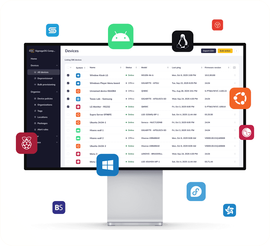 Remotely manage and monitor any digital signage hardware, regardless of brand, device, generation, or location.
